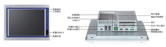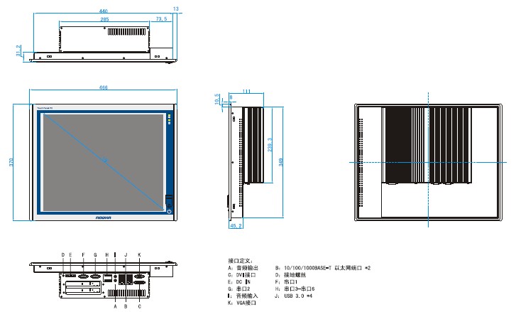前面板:铝镁合金材质,可达到IP65防护等级 箱体结构:全钢型箱体结构,高温烤漆处后嵌大面积鳍状散热铝片 安装方式:支持面板嵌入式、壁挂和VESA安装 电源:85V-264V AC 或 9-30V DC 面板颜色:白色(喷塑) 总体尺寸 466 x 370 x 111 mm (宽x高x深) 箱体尺寸 440 x 349 x 103 mm (宽x高x深) 开孔尺寸 443 x 352 mm(宽x高) 重量:10kg
