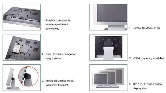 ■ 15" TFT LCD,亮度350cd/m² ■ 最大分辨率1024x768 ■ 支持高端Intel CM-1.0GHz低功耗处理器和双显示 ■ 最大支持2G内存,集成双网口和声卡■ 支持4个USB2.0、4个COM口■ 支持直流/交流电源供电 ■ 支持八线电阻式触摸屏 ■ 正面防水等级达到IP65/NEMA4 | |