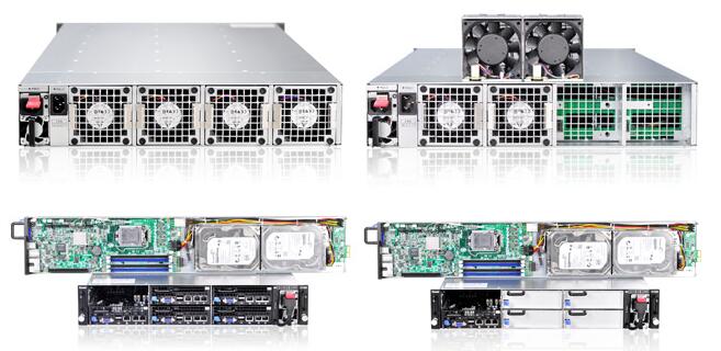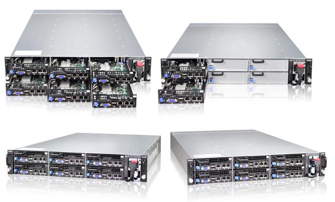 ◆ 每个服务器节点支持2个3.5英寸或4个2.5英寸SATA硬盘,整个系统最大支持12个3.5英寸或24个2.5英寸硬盘。
