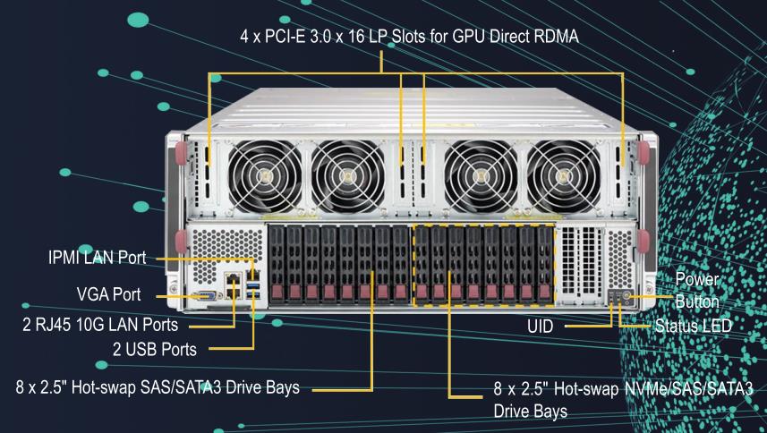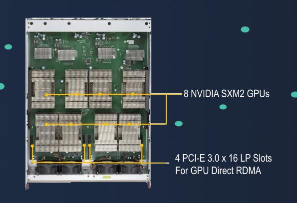 - 最大可支持 8 块 NVLINK2.0 接口的 GPU 计算卡,数十倍于 PCI-E 3.0 x16 的带宽可提供强大的性能和超高的扩展能力;