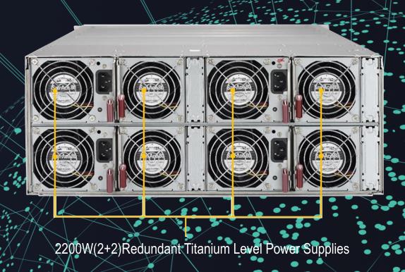 -2200W 的商效能热插拔冗余 2+2 电源(钦金级别转化效率在 96% 有效转化率),在服务器离负荷运转时提供了更好的稳定性,