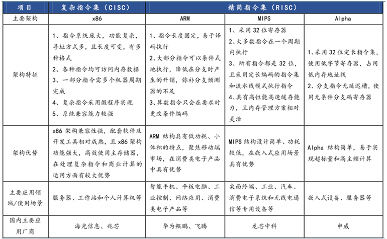 按指令集架构,国产CPU厂商采用的路线可分为四类:x86、Arm、MIPS、Alpha。