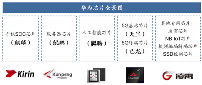 华为自研芯片有五大类,包括服务器芯片鲲鹏系列、手机SoC芯片麒麟系列、人工智能芯片昇腾系列、5G基站芯片天罡系列、5G终端芯片巴龙系列等,以及凌霄芯片、NB-IoT芯片、视频编码解码芯片以及SSD控制芯片等一系列专用芯片。