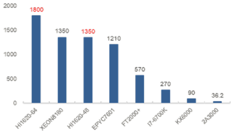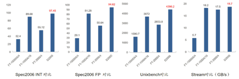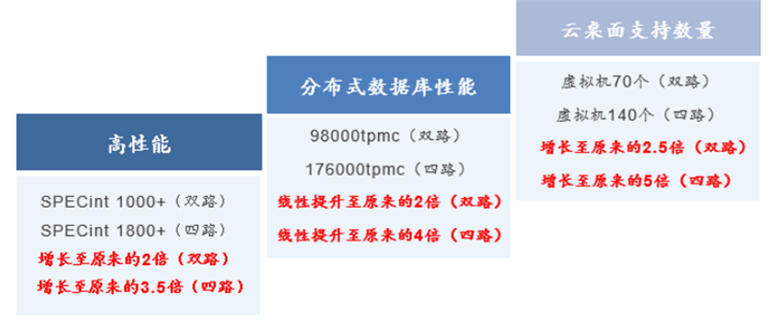 其2020年发布的腾云系列新一代可扩展多路服务器芯片腾云S2500与FT 2000+相比性能大幅提升。在整机性能方面,双路的SPECint分值为原来的2倍,四路的SPECint 值为原来的3.5倍;在分布式数据库性能方面,双路服务器的tpmc值线性提升至原来的2倍,四路的tpmc值线性提升至原来的4倍;在云桌面支持方面,双路服务器支持虚拟机70个,是原来的2.5倍,四路服务器支持140个,是原来的5倍。
