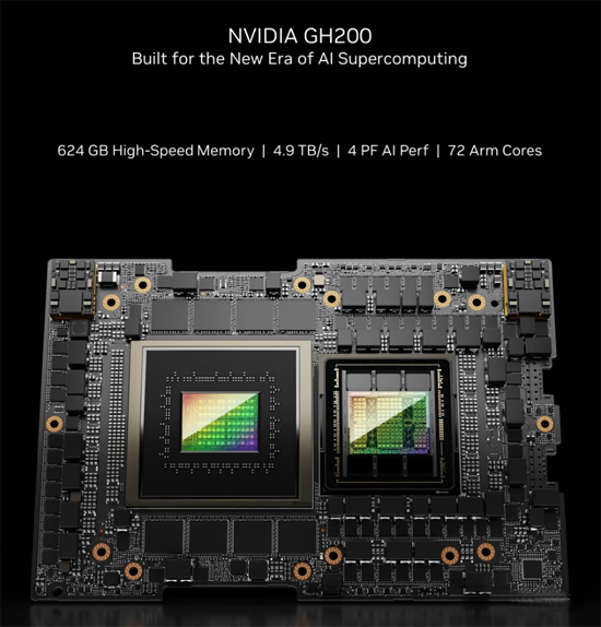 当用H200代替H100,与英伟达Grace CPU搭配使用时,就组成了性能更加强劲的GH200 Grace Hopper超级芯片——专为大型HPC和AI应用而设计的计算模块。