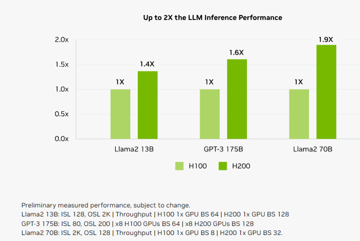 如上所说,在处理Llama 2等大语言模型时,H200的推理速度比H100提高了接近1倍。