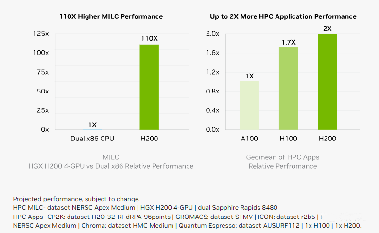 相较于H100,H200在处理高性能计算的应用程序上也有20%以上的提升。