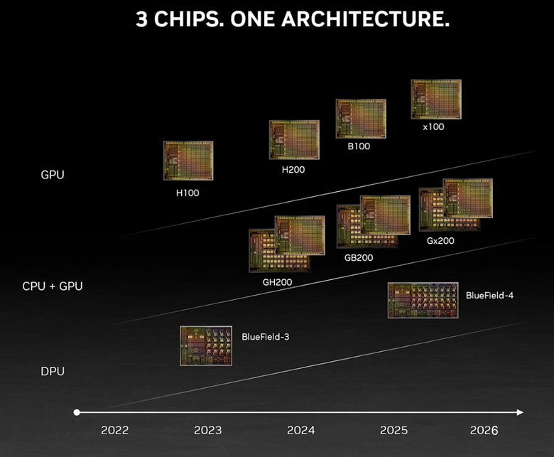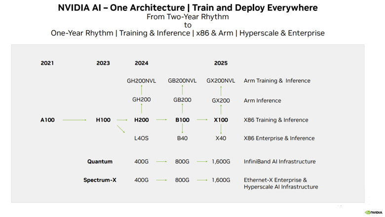 而英伟达官方,也公布了官方的产品路线图,将使用同一构架设计三款芯片,在明年和后年会继续推出B100和X100。