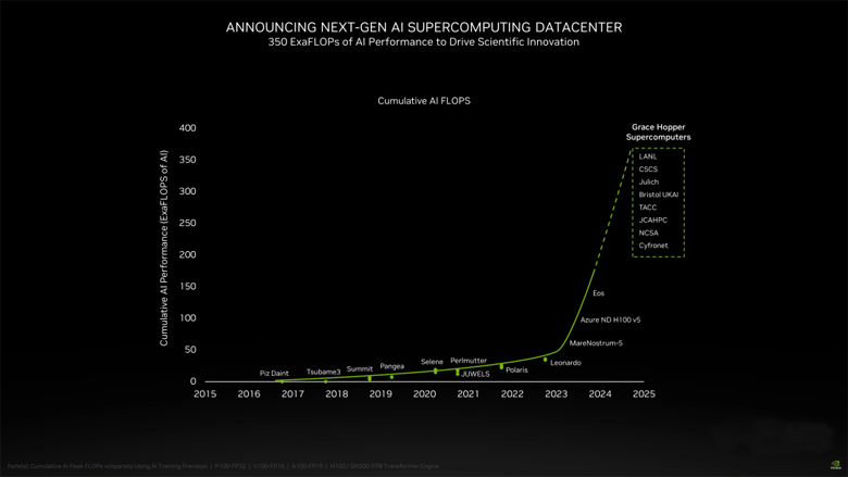它能提供93 Exaflops的低精度AI算力和1 Exaflop的高精度(FP64)算力。这台超级计算机预计将于2024年安装完毕。