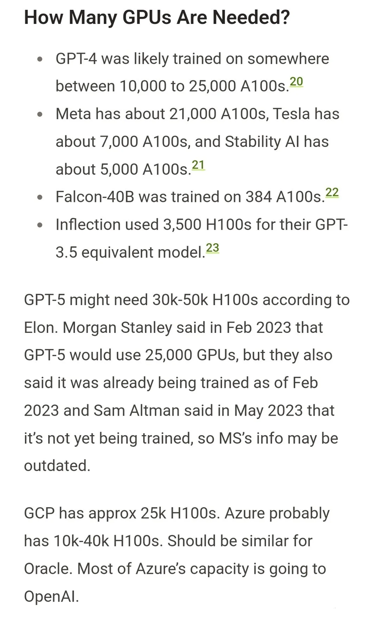 GPT-4大约是在10000-25000块A100上训练的;Meta需要大约21000块A100;Stability AI用了大概5000块A100;Falcon-40B的训练,用了384块A100。根据马斯克的说法,GPT-5可能需要30000-50000块H100。摩根士丹利的说法是25000个GPU。
