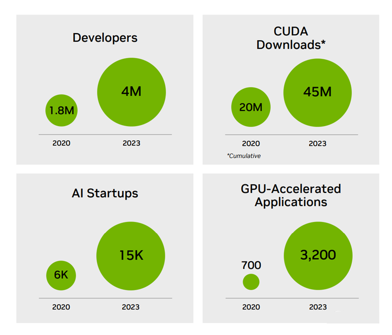 至于H200系统,英伟达表示预计将于明年二季度上市。 同在明年,英伟达还会发布基于Blackwell架构的B100,并计划在2024年将H100的产量增加两倍,目标是生产200多万块H100。而在发布会上,英伟达甚至全程没有提任何竞争对手,只是不断强调「英伟达的AI超级计算平台,能够更快地解决世界上一些最重要的挑战。