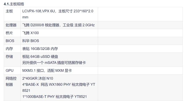 XMVPX-108 是一款基于飞腾 D2000/8 处理器的低功耗逻辑运算和图形处理 VPX刀片,板贴 32GB DDR4 内存搭载飞腾 X100 套片,满足通用 10 接口功能。GPU 采用 MXM 小型插卡形式,搭配 8GB 显卡。提供 Rapid10.40GBASE-KR4.1000base-X等网络接口满足系统业务互连,控制 面互连等多种网络互连需求。腾锐, D2000 集成了8个飞腾自主研发的高性能内核 FTC663,兼 容 64 位 ARMv8 指令集,主频 2.3GHz,TDP 功耗 35W,并集成了丰富的 1/0 接口,支持飞腾自 主定义的处理器安全架构标准 PSPA 1.0,可满足更复杂应用场景下对性能和安全可信的需求。