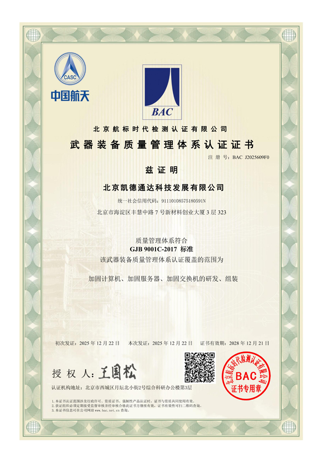 近日,北京凯德通达科技发展有限公司传来重大喜讯——经过权威认证机构的严格审核,公司正式通过GJB9001C-2017武器装备质量管理体系认证,成功获取认证证书。这一里程碑式的成果,标志着公司在武器装备相关产品的研发、生产、服务等全流程质量管理水平已达到国家军用标准要求,正式具备进入武器装备科研生产领域的核心资质,为公司深耕军工市场、践行国防建设使命奠定了坚实基础。